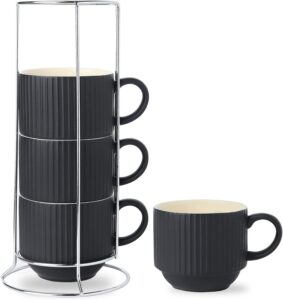 HASENSE Coffee Mug Ceramic Set of 4 with Stand – 15 oz Stackable Large Porcelain Ribbed Latte Cup Set for Cappuccino, Tea, Hot Cocoa, Drinks – Dishwasher & Microwave Safe, Black