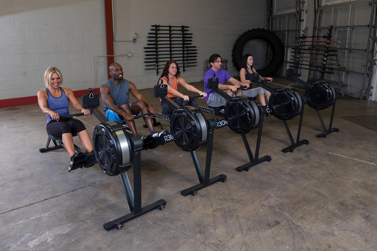 The Endurance by Body-Solid R300 Indoor Rower delivers an effective low-impact cardio and total body workout. Not only does the rowing movement provide users with high-intensity calorie-burning cardio but works quadriceps, hamstrings, abdominals, obliques, lats, biceps, triceps, hip flexors and more. User-controlled air resistance puts users in full control for a balanced and coordinated workout. The R300 is a self-generating machine eliminating power requirements for peak energy efficiency in home or commercial settings. A precision-engineered flywheel design minimizes noise. Nickel-plated chain offers unmatched durability in even the most intense environments. A textured, ergonomic handle allows users to row with natural hand and arm positions while fully adjustable footrests provide users a safe and comfortable workout on the R300 Indoor Rower. A convenient cell phone holder can be used for both entertaining and workout tracking purposes. The interactive console reports on time, heart rate, calories, paddle width, stroke rate, distance cycle and watts and is Polar compatible. 8 different exercise programs -Quick Start, Distance, Time, Calories, Game, Intervals (20/10. 10/20. 10/10) are also built into the console. Ideal for home, commercial and group workout settings. Rowers have seen a resurgence of popularity in recent years driven in part by their usage in cross fit and other hot exercise programs. Pair this with our other cross fit oriented product like our FB300 Fan Bike and our new Power Racks and Half Racks to satisfy the needs of any training facility.