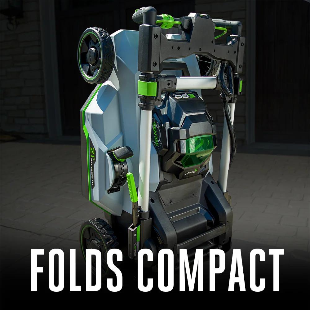 The EGO POWER+ 21″ Select Cut Self-Propelled Mower delivers up to 7.0 foot-pounds of torque for performance that exceeds the power of gas. The Select Cut™ Multi-Blade Cutting System is equipped with three interchangeable lower blades: the Mulching Blade, High Lift Bagging Blade, and Extended Runtime Blade. The Mulching Blade comes installed on the lawn mower and is ideal for weekly mulching, giving you the mulching quality expected from a high-end gas lawn mower. The High Lift Bagging Blade provides extra suction ideal for bagging, leaving your yard free of clippings. The Extended Runtime Blade provides an optimal balance of cut quality and runtime for all around performance. All three blades can be used interchangeably based on your desired cut. The Upper Blade is used in combination with the lower blade chosen to slice the grass into fine fragments, greatly enhancing cutting performance with all grass types. EGO Touch Drive™ self-propelled technology puts complete control of the self-propel system in the palm of your hands by using pressure to engage the system. Easily control the variable speed with a dial positioned at your fingertips for safe and convenient operation. The Select Cut™ cordless lawn mower harnesses the power of the industry’s most advanced 56V ARC Lithium™ batteries to deliver up to 60 minutes of runtime on a single charge with the recommended 7.5Ah battery. Three-in-one functionality delivers your choice of mulching, side discharge, or bagging your grass clippings; an easy-access two-bushel grass collection bag is included. This electric lawn mower includes bright LED lights for added visibility when mowing at dawn or dusk, and it folds for compact storage between cuts. Experience Power Beyond Belief™ with the EGO POWER+ 21″ Select Cut™ Self-Propelled Lawn Mower.