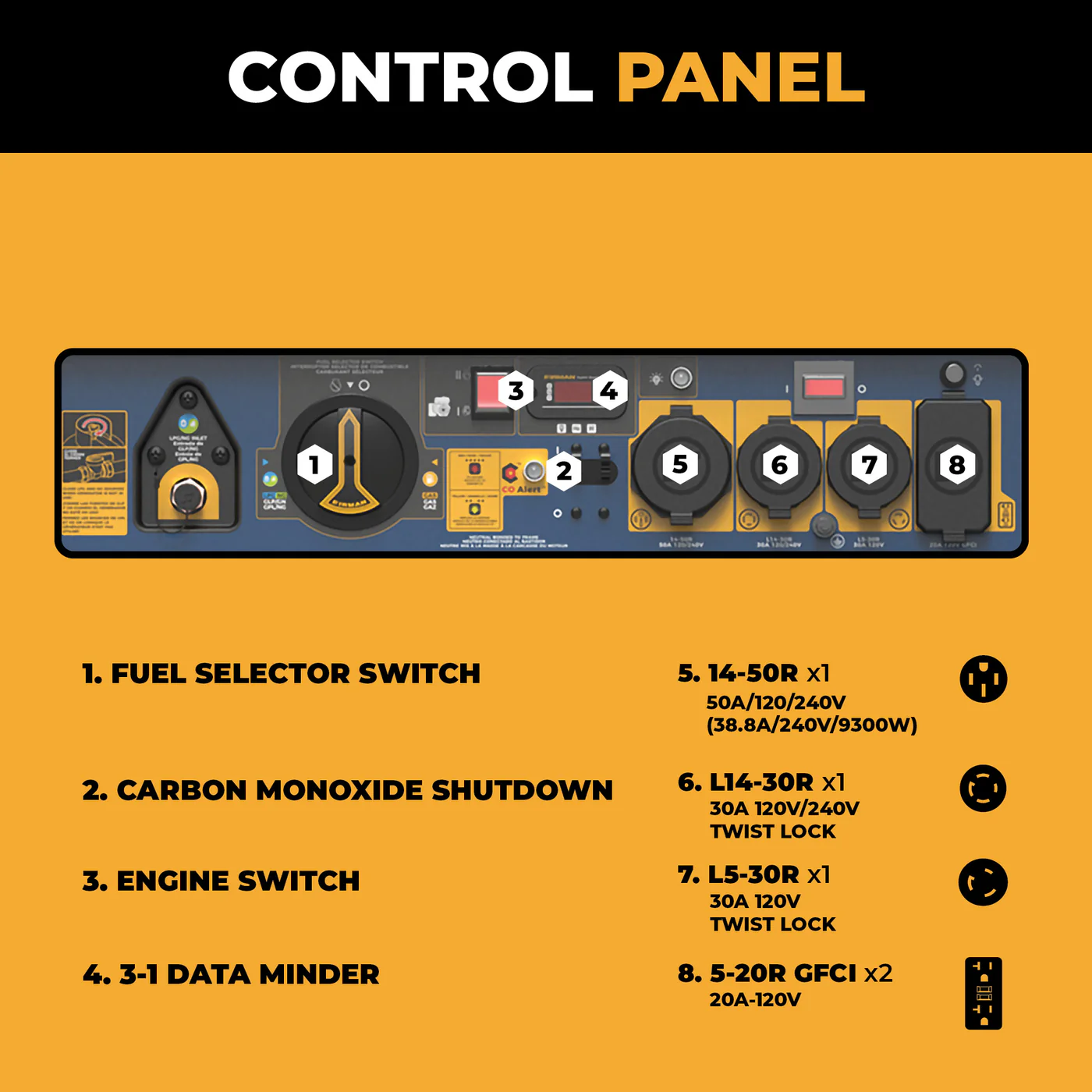 • (1) 14-50R 120V/240V 50A (38.8A/240V/9300W)