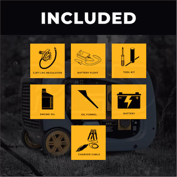 - LP hose w/ reg, Engine oil, oil funnel, tool kit, & 12V battery cables