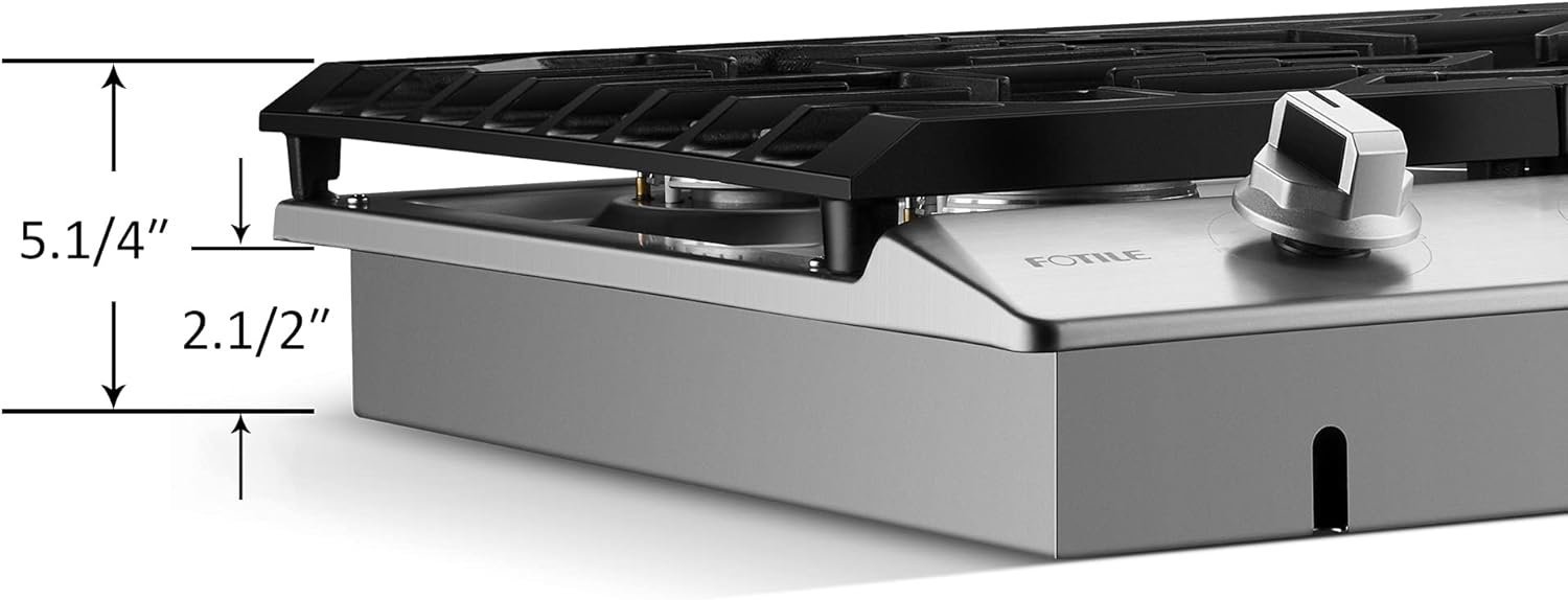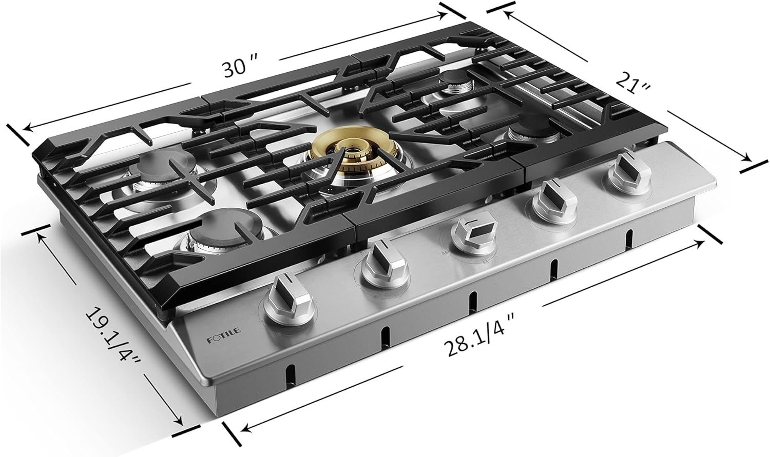 - VERSATILE TRI-RING BURNERS FOTILE GLS30501 culinary grade cooktop is excellent for cooking in versatile styles with a 22,000 BTUs high output tri-ring center burner for boiling, searing, pan frying and stir frying, two 13,000 BTUs left burners offering high heat along with optional griddle control, and two dedicated simmer burners with 3000 and 6000 BTUs delivering consistent and accurate low heat for delicate cuisines.