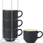 Our ceramic coffee mug has a distinctive vertical stripe embossed design and it can contain up to 15 OZ coffee or tea, which would surely satisfy your daily needs.This stackable neatly coffee mug set of 4 with stand design helps you save a lot of counter or cabinet space. Just take a mug from this extremely stable and non-shaking base and enjoy your coffee time.
