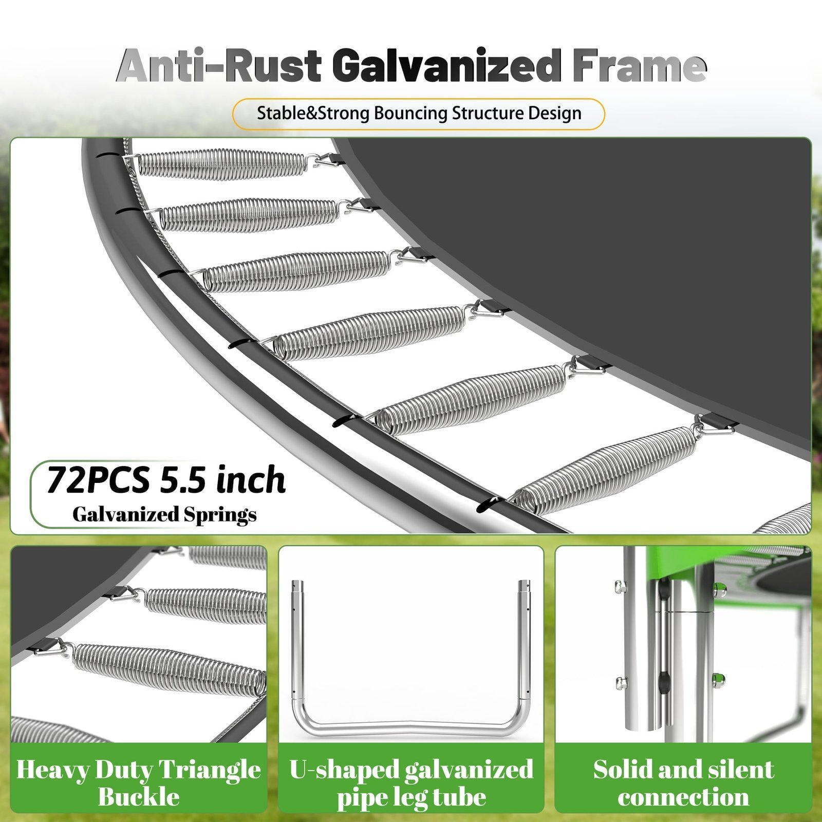 - 【Safety 12Ft Trampoline】Mersco 1320 lbs load-bearing 12ft trampoline, adopts 1.2mm fully galvanized steel frame, 5.5in long galvanized springs, can accommodate 5-7 children, and meets advanced international component, assembly and usage standards. In addition, the 72-inch high-density PE safety net is UV-resistant, waterproof and tear-resistant. Double zipper and buckle closure system ensures the safety of users when jumping.Note: Single-person weight limit is 330 lbs.