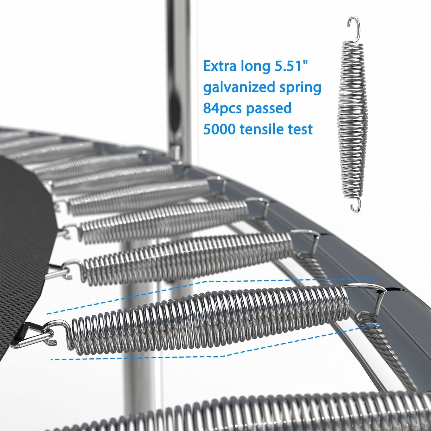 - 【Safety 15Ft Trampoline】Mersco 1320 lbs load-bearing 15ft trampoline, adopts 1.2mm fully galvanized steel frame, 5.5in long galvanized springs, can accommodate 7-9 children, and meets advanced international component, assembly and usage standards. In addition, the 72-inch high-density PE safety net is UV-resistant, waterproof and tear-resistant.Unique 6 balance bar plus 6 W-shaped legs provide double stability. Double zipper and buckle closure system ensures the safety of users when jumping.Note: Single-person weight limit is 330 lbs.