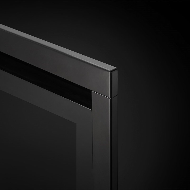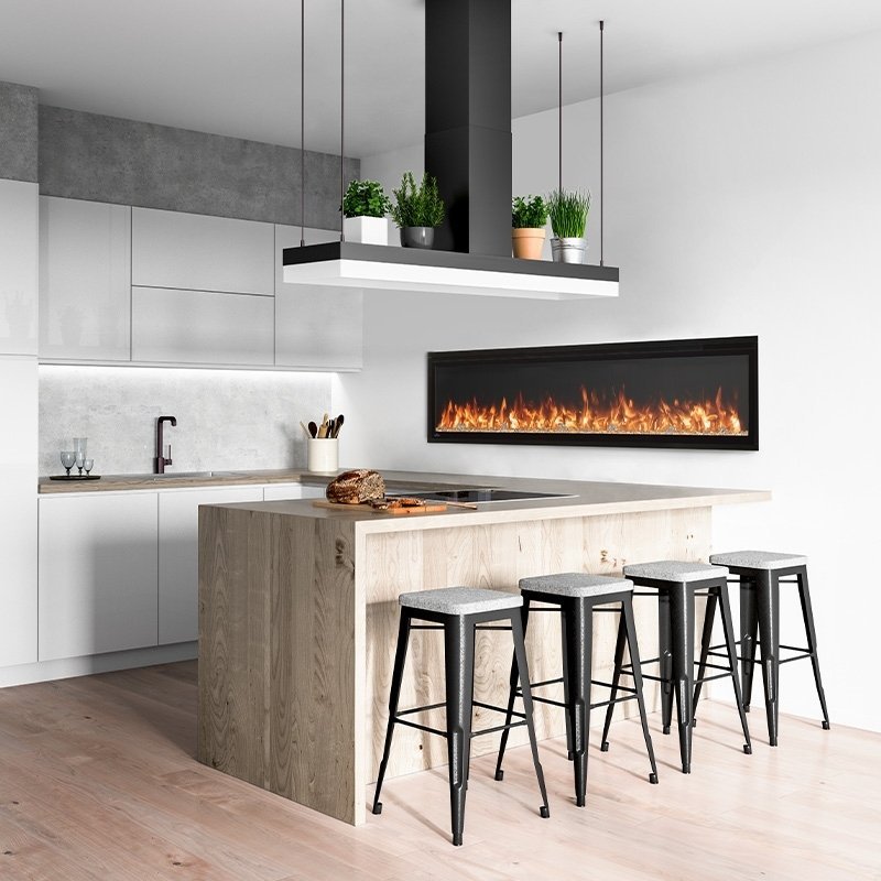 • The black, nearly frameless finish surrounding this modern, linear, electric fireplace creates a minimalist look that doesn’t interfere with your décor, enhancing the fire aspect of the fireplace