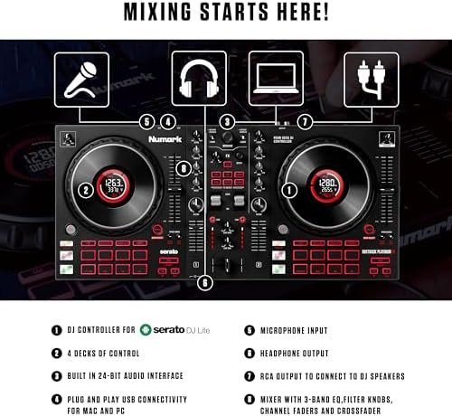 • Ready to Connect To all Your DJ Equipment Microphone input, headphone output and RCA output to connect to DJ speakers, plus a mixer with 3-band EQ, filter knobs, channel faders and crossfader