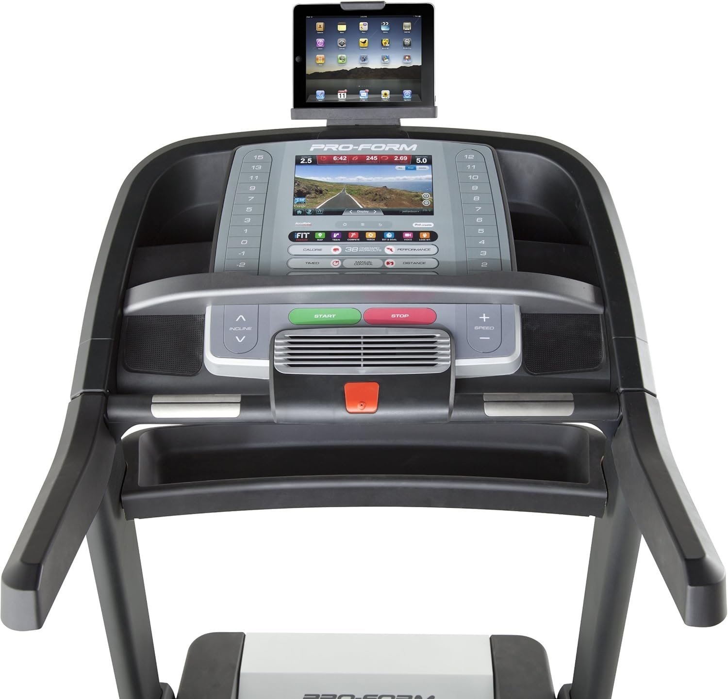 - iPad holder, HD video workouts, 38 training apps, wireless chest strap and dual-grip heart rate monitor