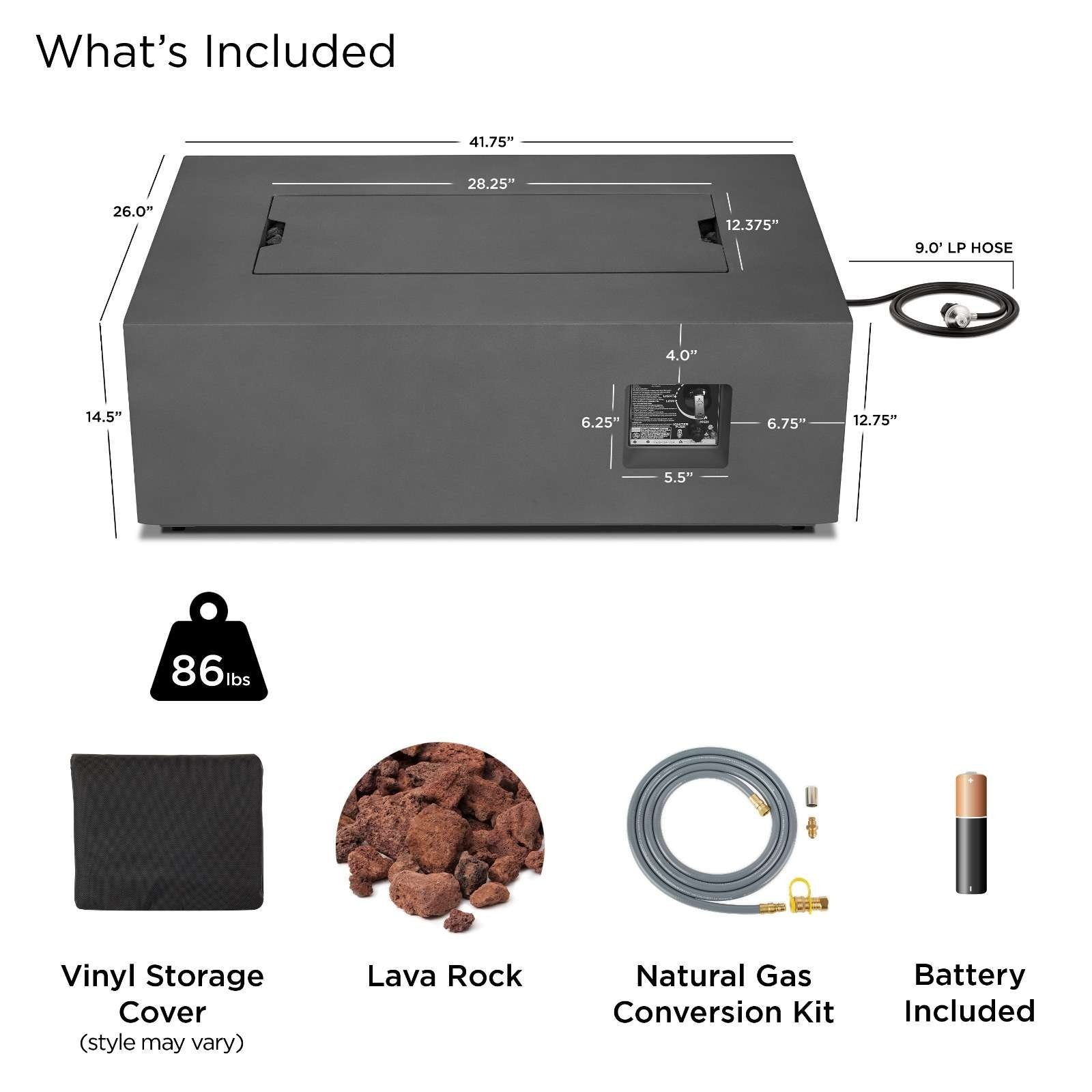 - Includes fire table with leveling feet, 23″ linear stainless steel burner, burner lid, lava rock filler, storage cover, AAA battery, tank seat, touch up paint for mist gray and weathered slate finish, 9’LP hose with regulator and natural gas conversion kit with 10 NG hose and quick connect socket