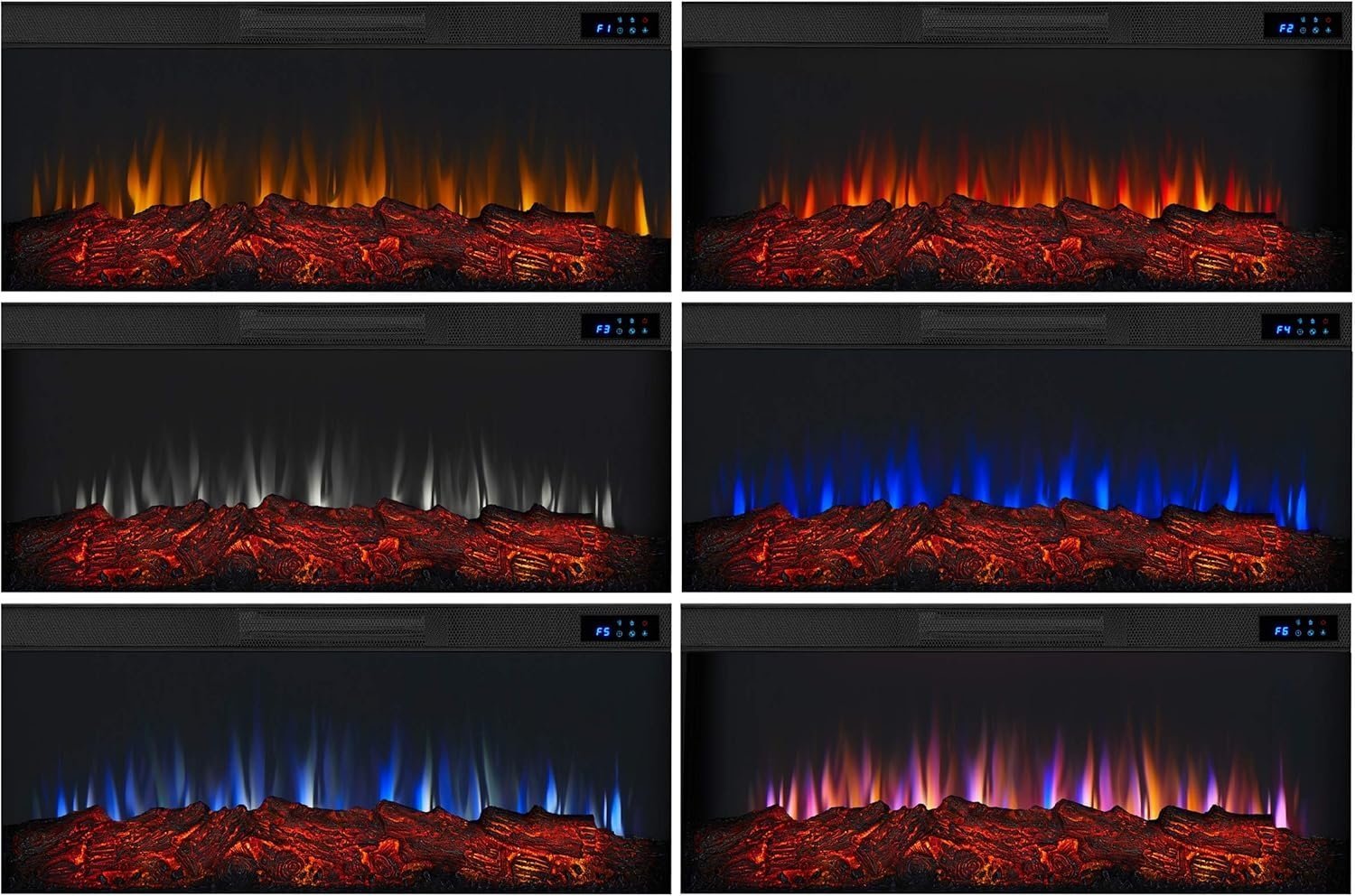 Multiple flame colors and brightness levels, adjustable thermostat, timer, overheat protection, automatic safety shut-off, option to turn off the heater for year-round heat-free flames.