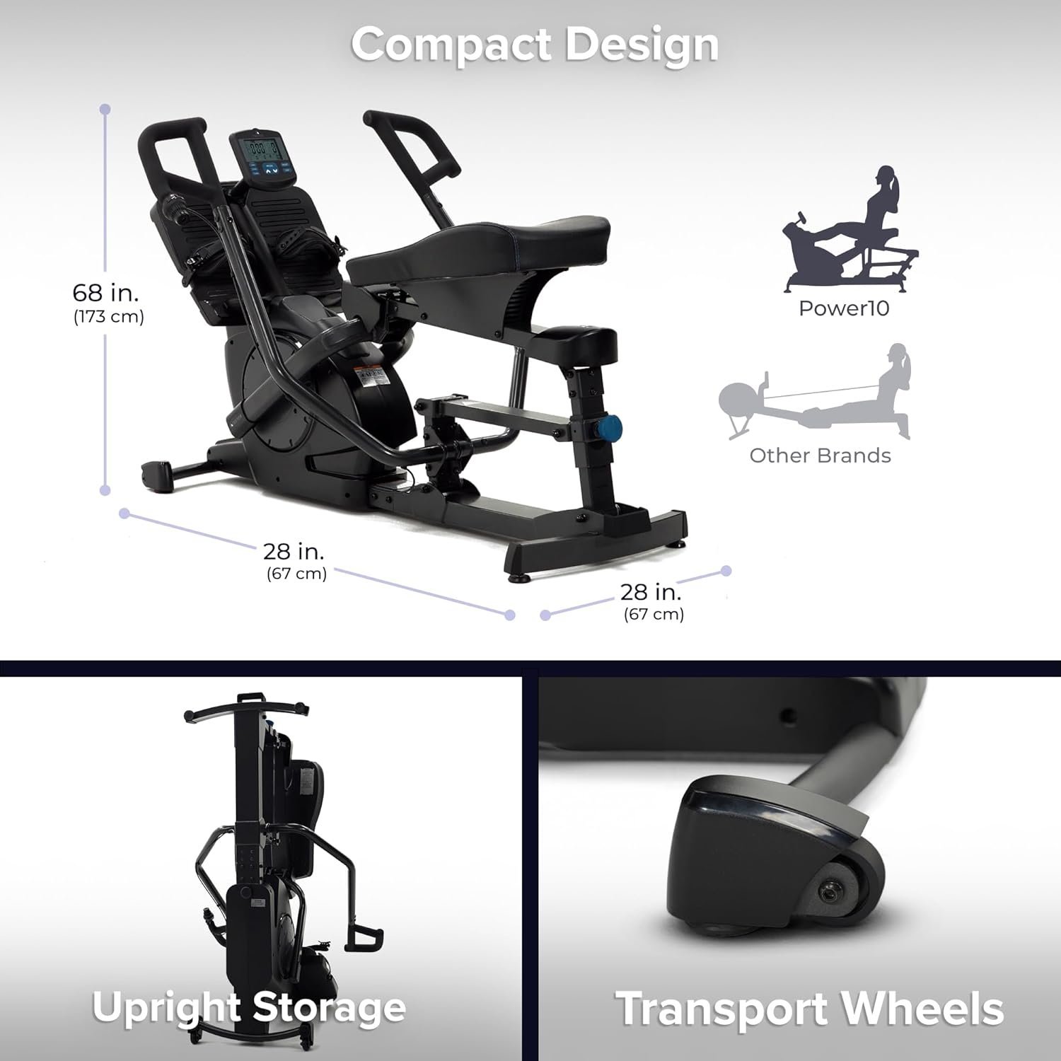 - COMPACT DESIGN & EASY STORAGE: No extra-long slide rail needed – the unique wheel and fork design maintains a compact motion and takes up less room than other rowing machines. Transport wheels make moving and storage easy.