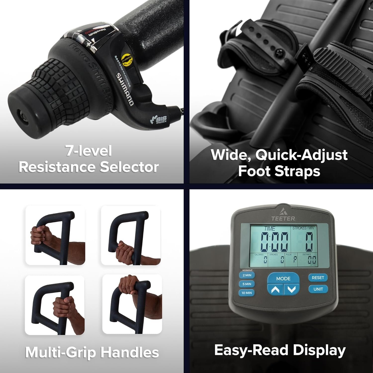 Experience the Power10, an elliptical rowing machine that helps you burn more calories and enhance muscle definition. Bi-directional resistance lets you engage more muscles with every workout for optimal strengthening, calorie burn, and high-intensity training. Pull for a traditional rowing motion that engages your back, biceps, delts, forearms, quads and calves. Perform a push and you can alternate to a separate set of muscles, working your chest, triceps, hamstrings, glutes and abs. The smooth, elliptical motion is easy on the joints while delivering an effective, total body workout. Track your stats with the digital performance monitor for time, pace, calories, distance Bluetooth HRM compatible (sold sep). With 7 levels of smooth magnetic resistance, you can choose to increase resistance for full muscle burn or lower resistance to build endurance. Multi-grip handles allow you to switch your grip and target more specific muscles in the upper body and the adjustable layback lets you optimize core engagement and power with each stroke. Access on-demand trainer-led workouts with the free Teeter Move App – no subscription or fees! From beginner classes to hard-driving HIIT workouts, our trainers will guide you to total fitness.