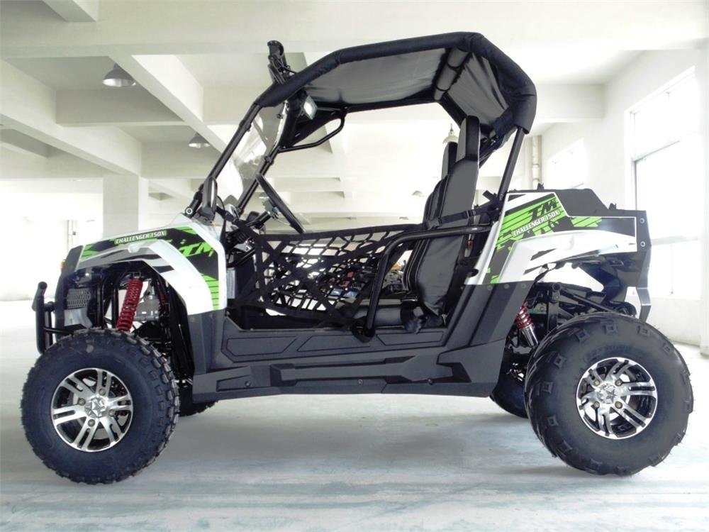 Explore the Great Outdoors with the TrailMaster Challenger 200X Deluxe UTV! It’s designed to be just the right size for many age groups with an adjustable steering column and reverse! Plus, there’s a full upper brush guard complete with sunshade canopy for all day riding, side protection rails with heavy-duty nylon safety nets and dual seats with seat harnesses to help keep you safe while riding.  The TrailMaster Challenger 200X UTV is powered by a reliable, electric start 4-stroke engine, automatic CVT transmission and chain driven dual rear wheel drive.  Stopping is extra firm thanks to 4-wheel hydraulic assist disc brakes.  The full suspension system and all-terrain tires help the Challenger 200X crawl over the toughest trails. The Challenger 200X UTV comes in several great colors!