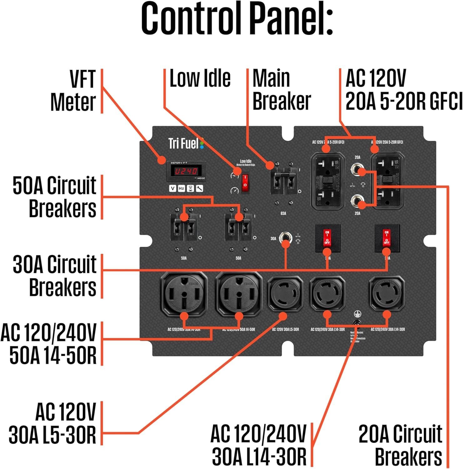 - PLUG IN, POWER UP: Two 120/240V 14-50R 50A outlets, two 120/240V L14-30R 30A outlets, all transfer switch and interlock kit ready; one 120V L5-30R 30A outlet, four GFCI 120V 5–20R 20A standard duplex outlets; all have rubber covers; includes oil, funnel, and setup guide to get you going right away