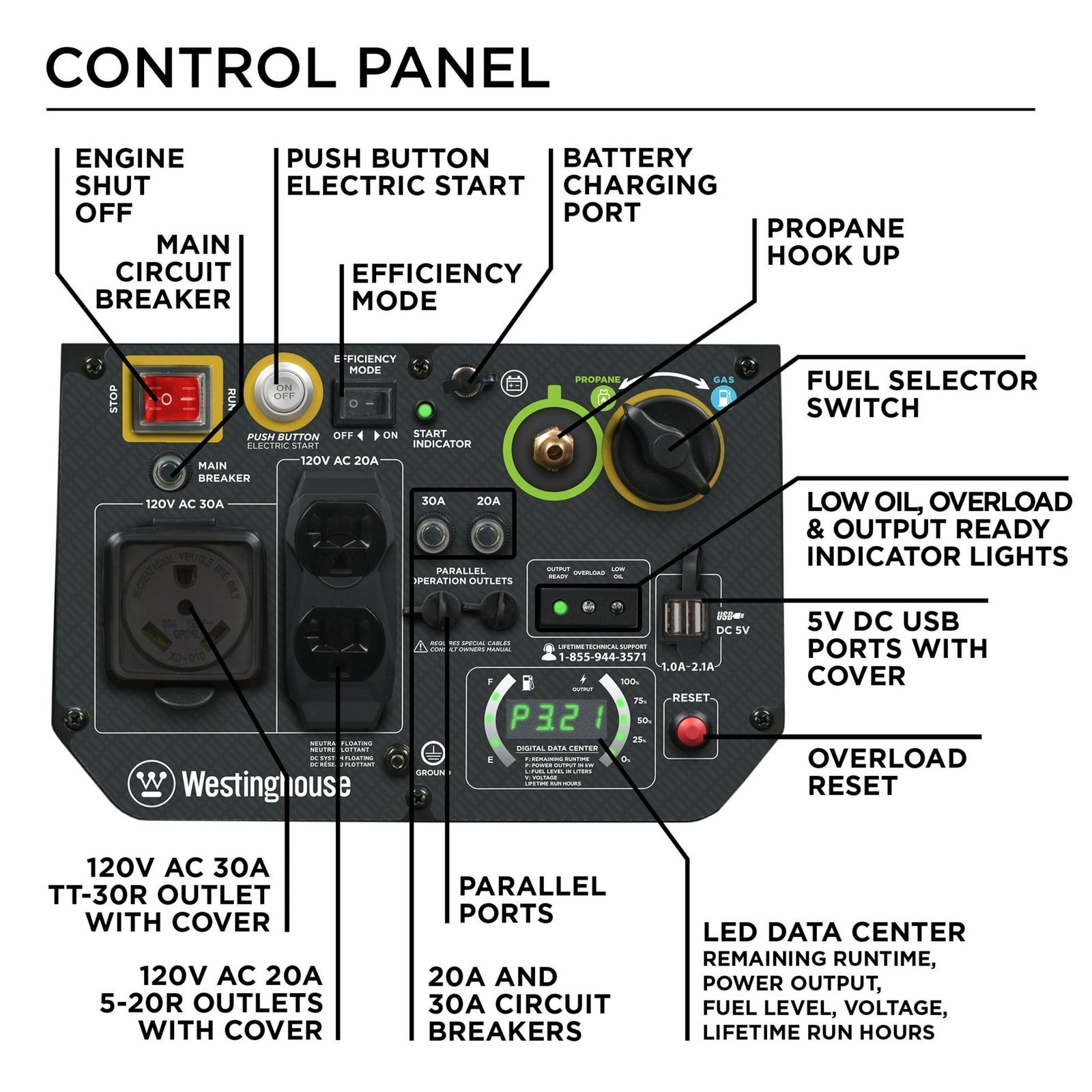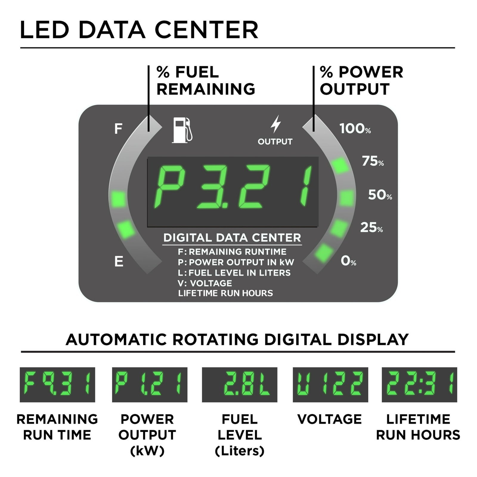 • Real-time LED display with runtime, remaining fuel, load/output, volts and lifetime hours data